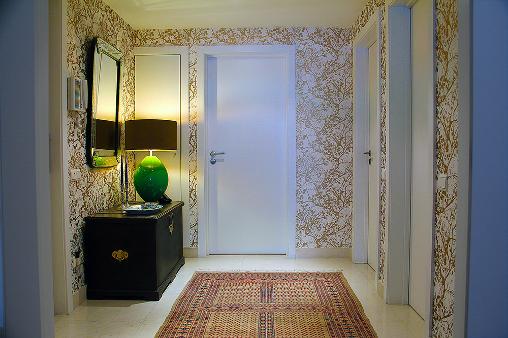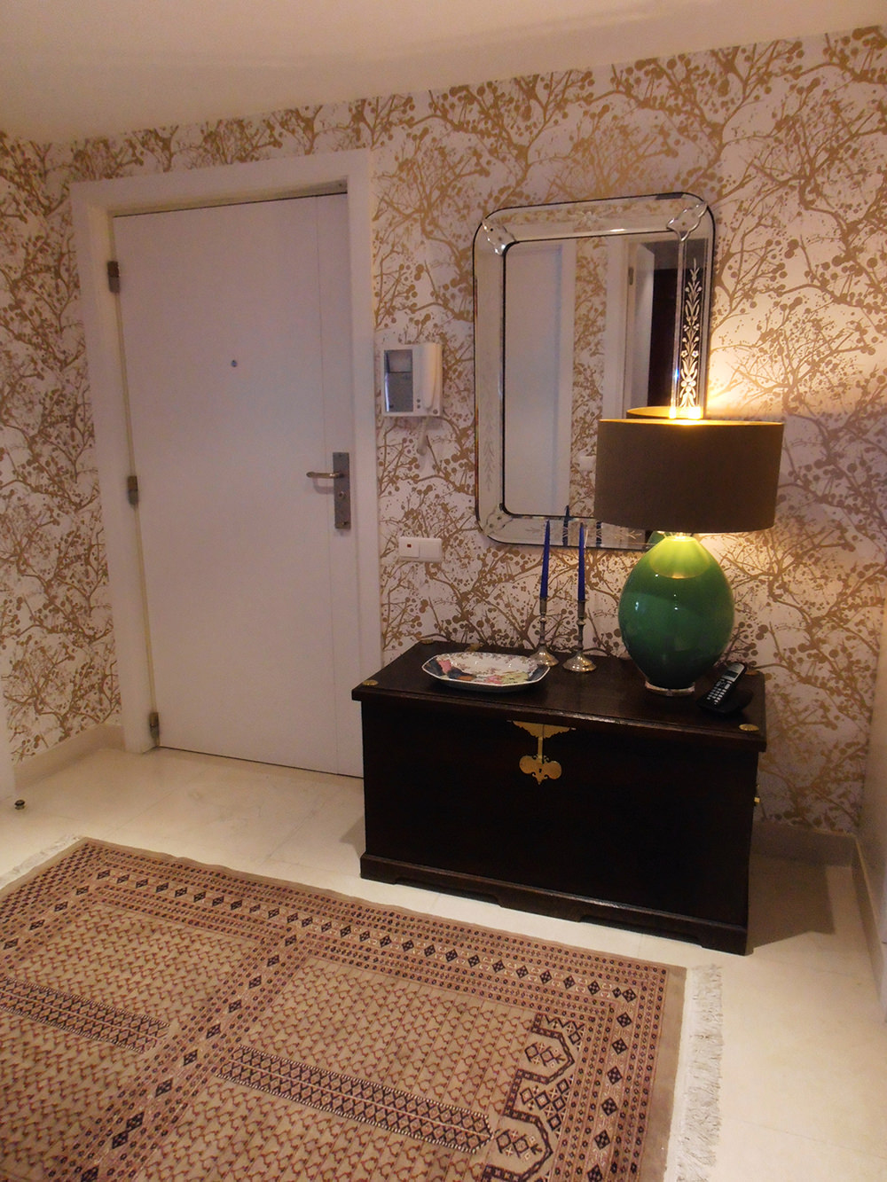 O hall foi integralmente revestido com papel de parede de padrão abstracto, nas cores creme e dourado, para acrescentar luminosidade e sofisticação a esta divisão.