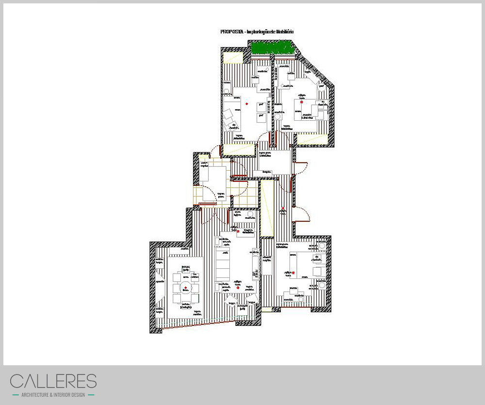 Foram desenhadas e confeccionadas peças de estofo feitas à medida, com especial destaque para o restauro do sofá da sala comum, que sofreu algumas alterações estruturais, assim como, a escolha de um novo estofo com aplicação de tachas prateadas a rematar, para melhor se enquadrar no ambiente.