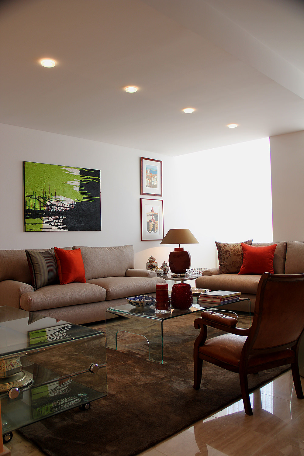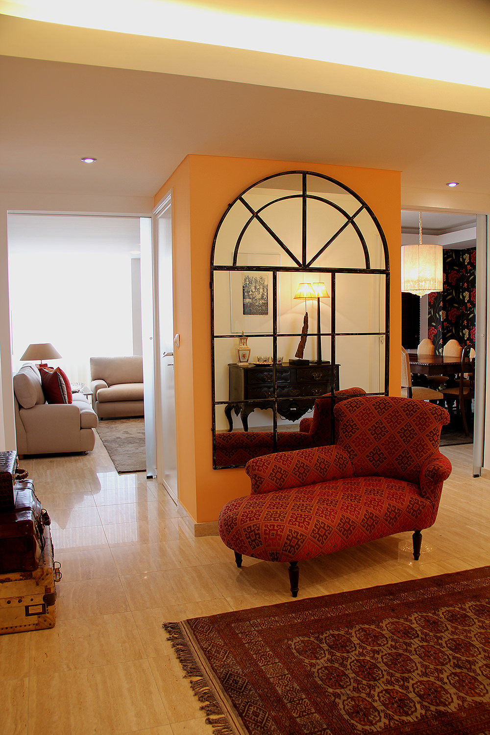 Uma base leve e neutra, que reflectisse mais luz era fundamental, por isso, foram pintadas paredes, tectos, portas e rodapés de branco. Para estabelecer algum contraste e dar destaque ao corpo central que ligava o hall com a sala comum, optou-se por pintá-lo num tom de salmão, ajudando no cruzamento da paleta de cores seleccionada para os têxteis e complementos de decoração.