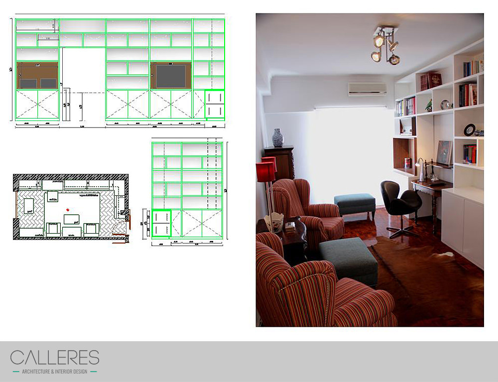A estante de livros desenhada e executada à medida para o escritório e todo o mobiliário e peças de decoração propostas, vieram reforçar um estilo de linhas simples e rectas, renovando o ambiente geral do apartamento.